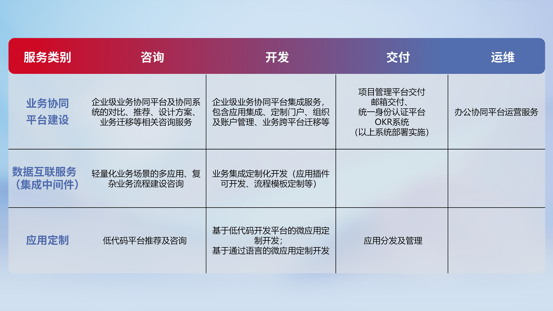 针对钉钉、、、、企微、、、IDaas等平台级产品提供产品的规划、、、、方案、、、、交付、、、、定制化开发等服务,,,,实现如统一协同办公、、智能客户服务、、混合会议管理、、智能数据查询、、等业务场景,,,实现数字化转型。。。